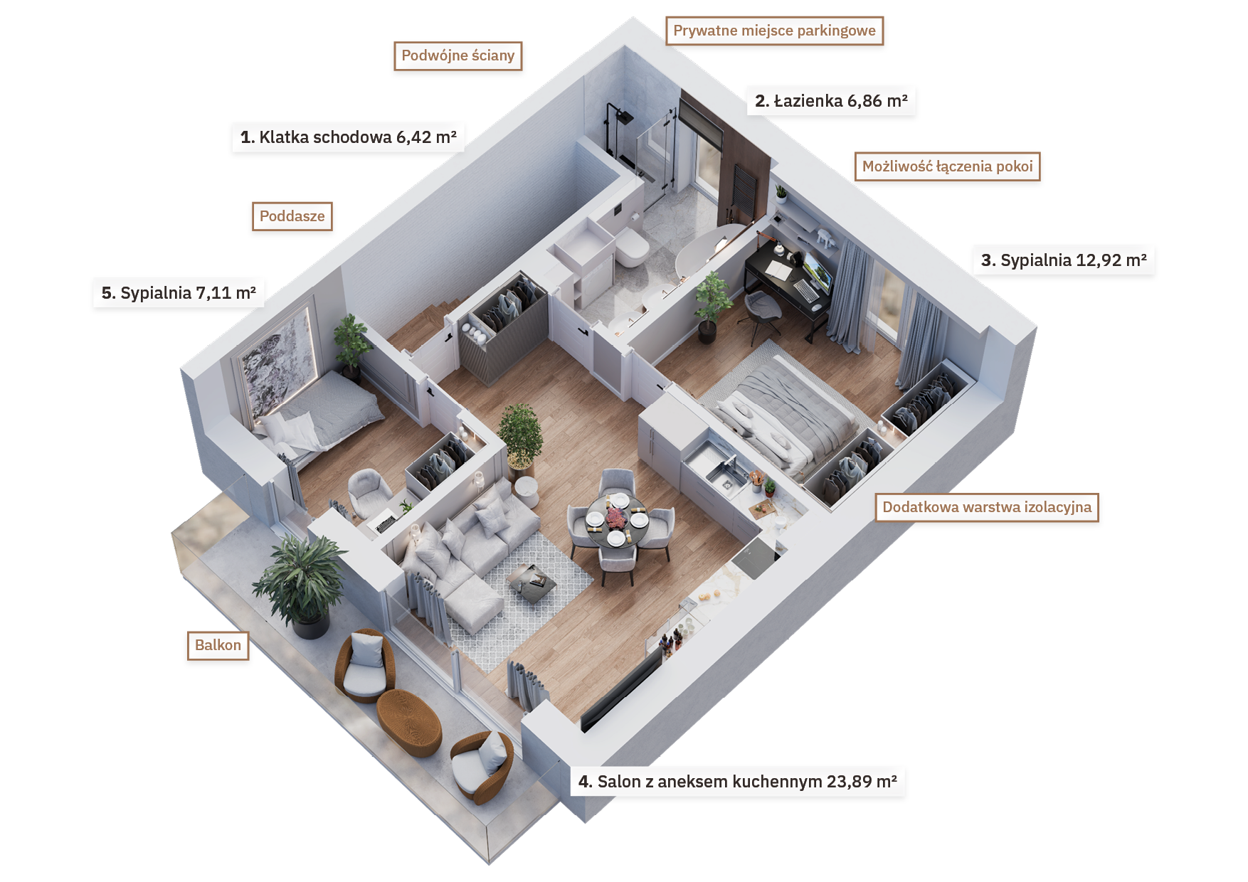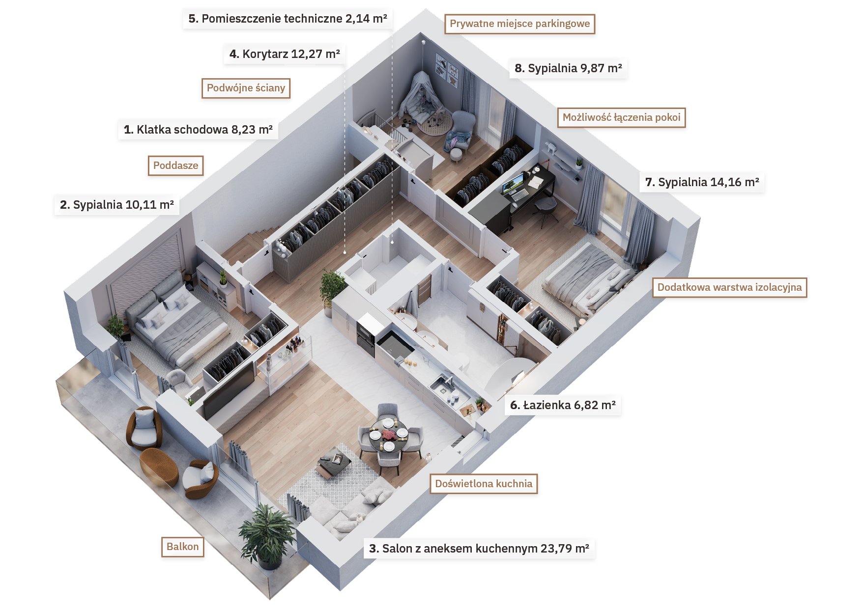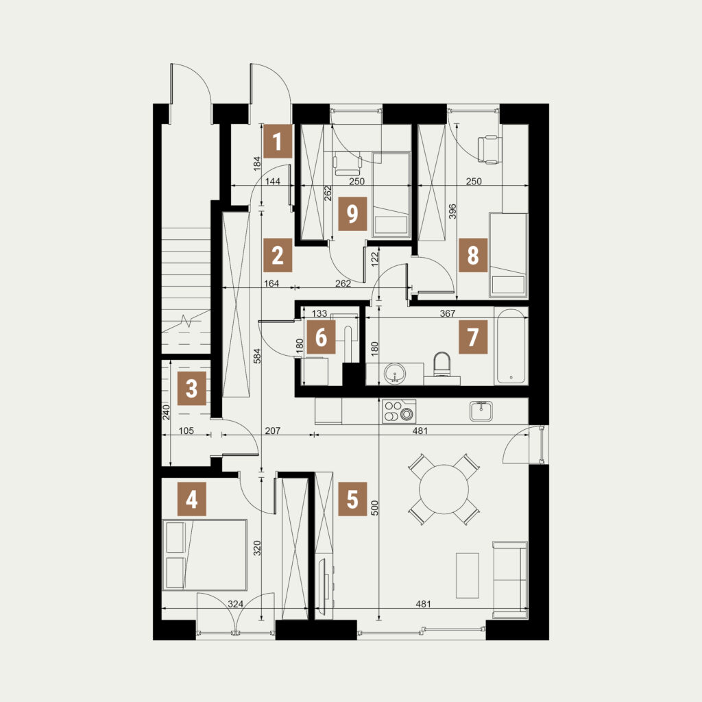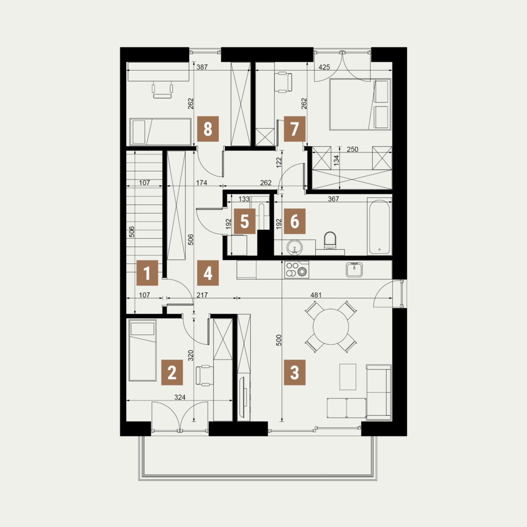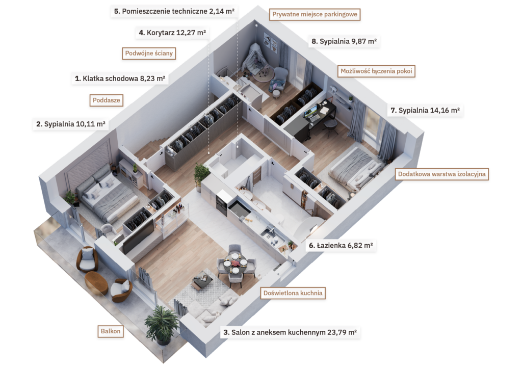 Układy wnętrz zostały zaprojektowane z myślą o dużej swobodzie aranżacji. Na etapie budowy masz możliwość łączenia pomieszczeń lub ich przebudowy. Istnieje także opcja połączenia mieszkań w dom, który idealnie dopasujesz do swoich potrzeb. Zakup na etapie budowy umożliwi na wczesnym etapie zrealizowanie dodatkowych zmian, np. stworzenie garderoby, dodatkowej łazienki czy przestronnej strefy do pracy zdalnej. Dla tych, którzy chcą podnieść komfort swojego apartamentu, dostępne są opcje montażu alarmu, rolet zewnętrznych, klimatyzacji, fotowoltaiki czy systemu smart home. W projekcie budynków uwzględniono niezbędne instalacje, dzięki czemu możesz łatwo dostosować swoje mieszkanie do nowoczesnych standardów.