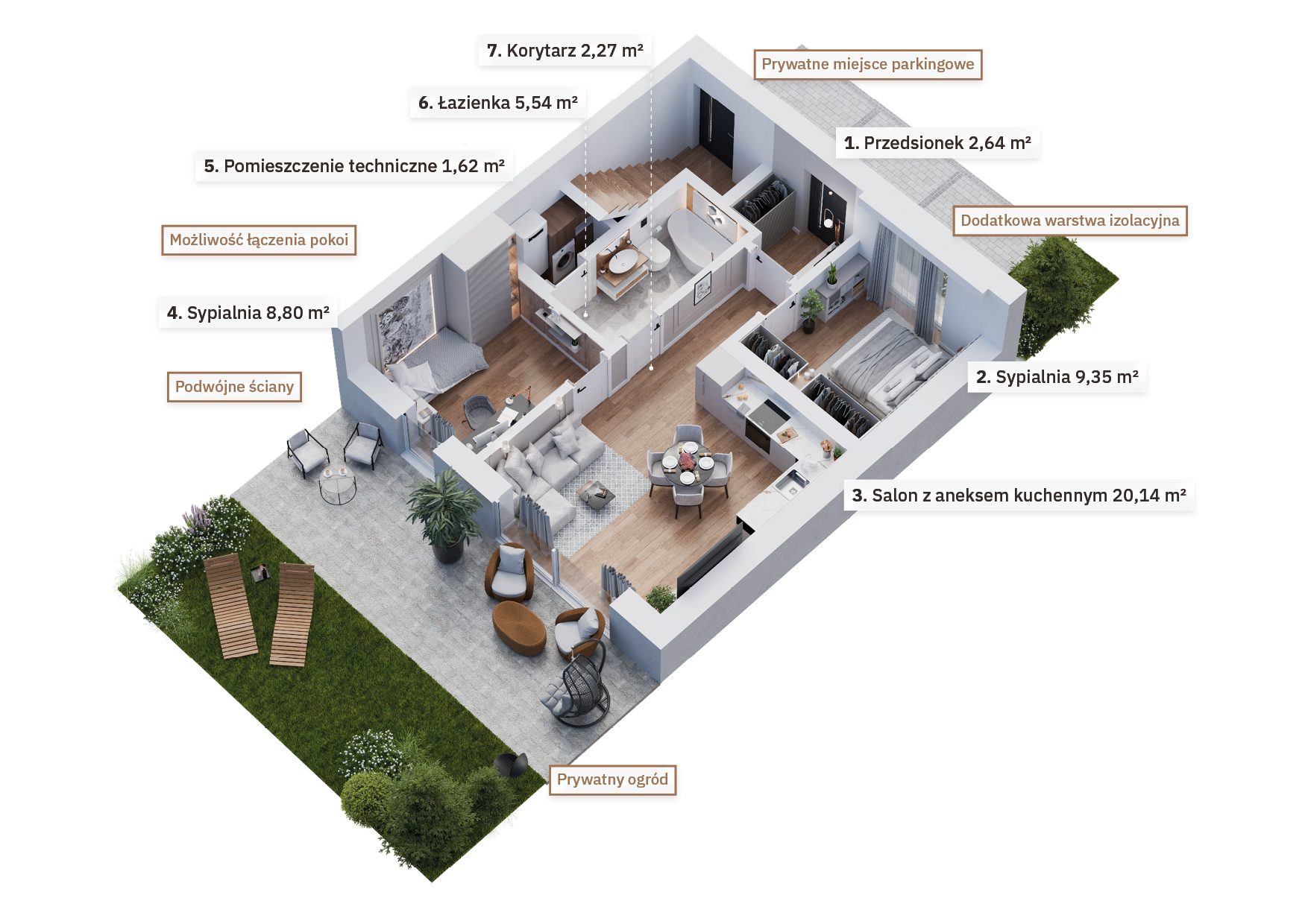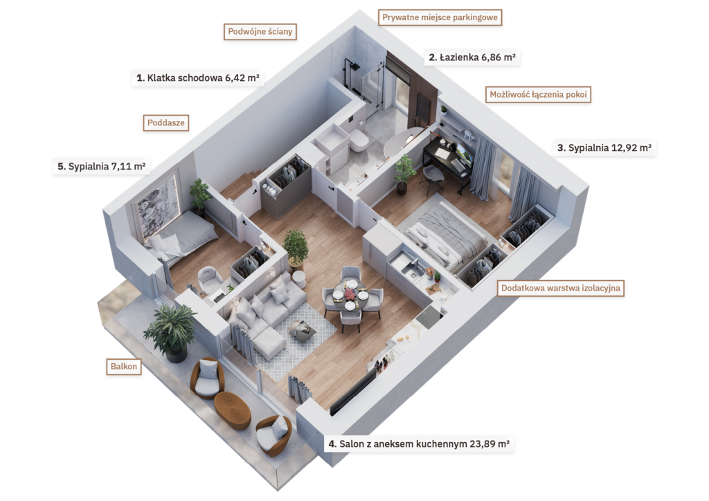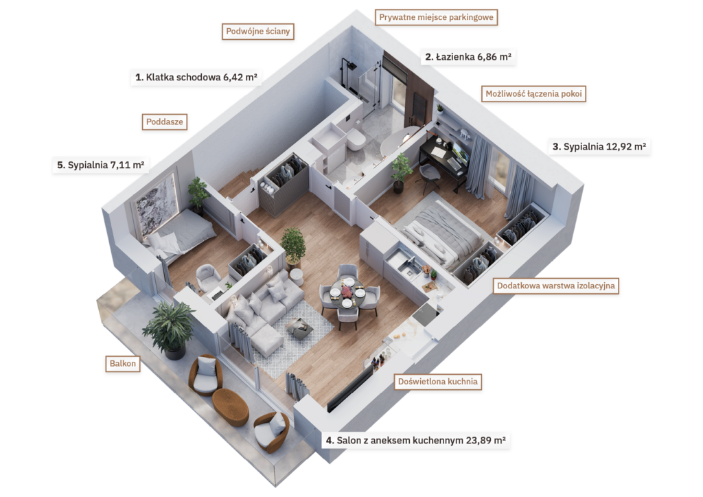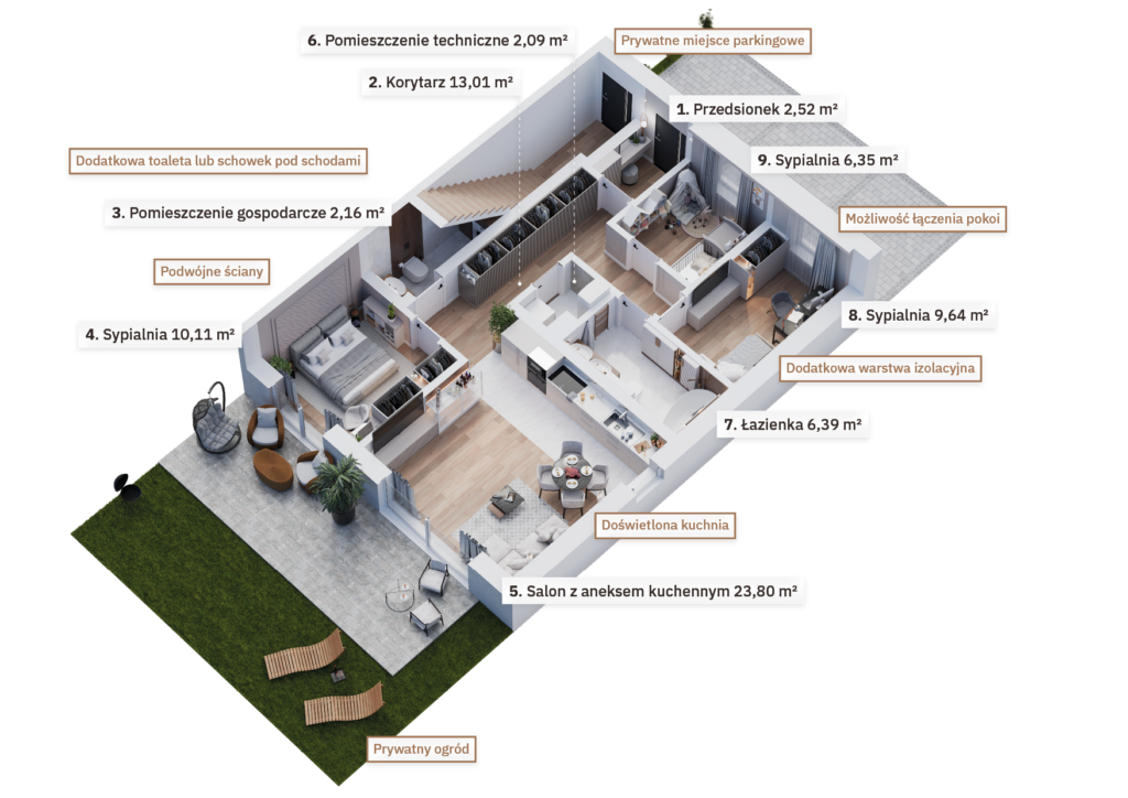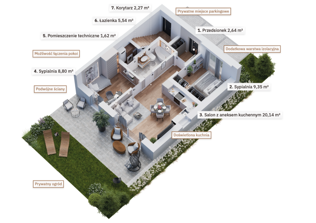 Osiedle zostało zaprojektowane z myślą o oszczędnościach – zastosowanie energooszczędnych technologii, takich jak pompy ciepła czy pakiety okienne minimalizujące straty ciepła, sprawia, że koszty utrzymania bezczynszowych apartamentów są wyjątkowo niskie. Wnętrza mieszkań zapewniają również komfortową ciszę – podwójne ściany między budynkami znacząco poprawiają izolację akustyczną, zapewniając spokojną atmosferę w każdym pomieszczeniu.