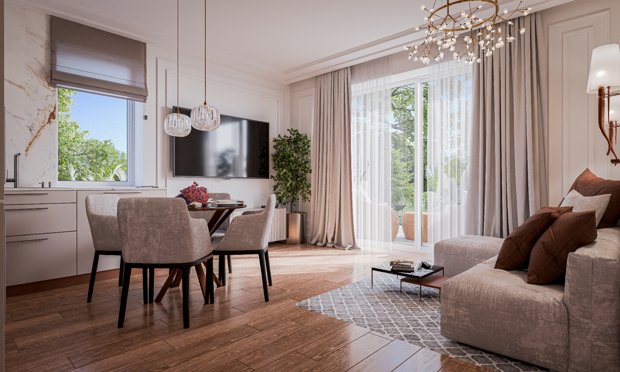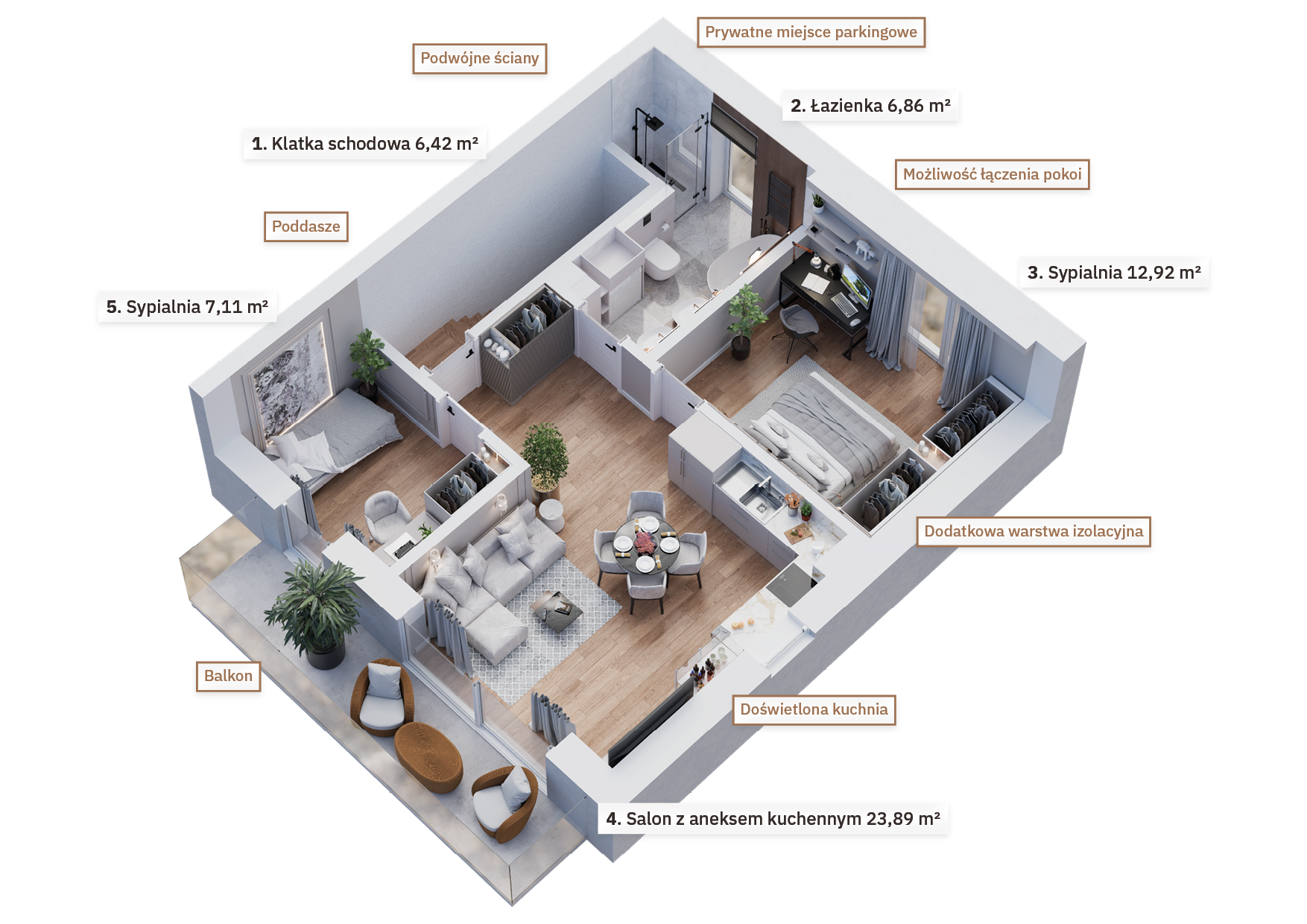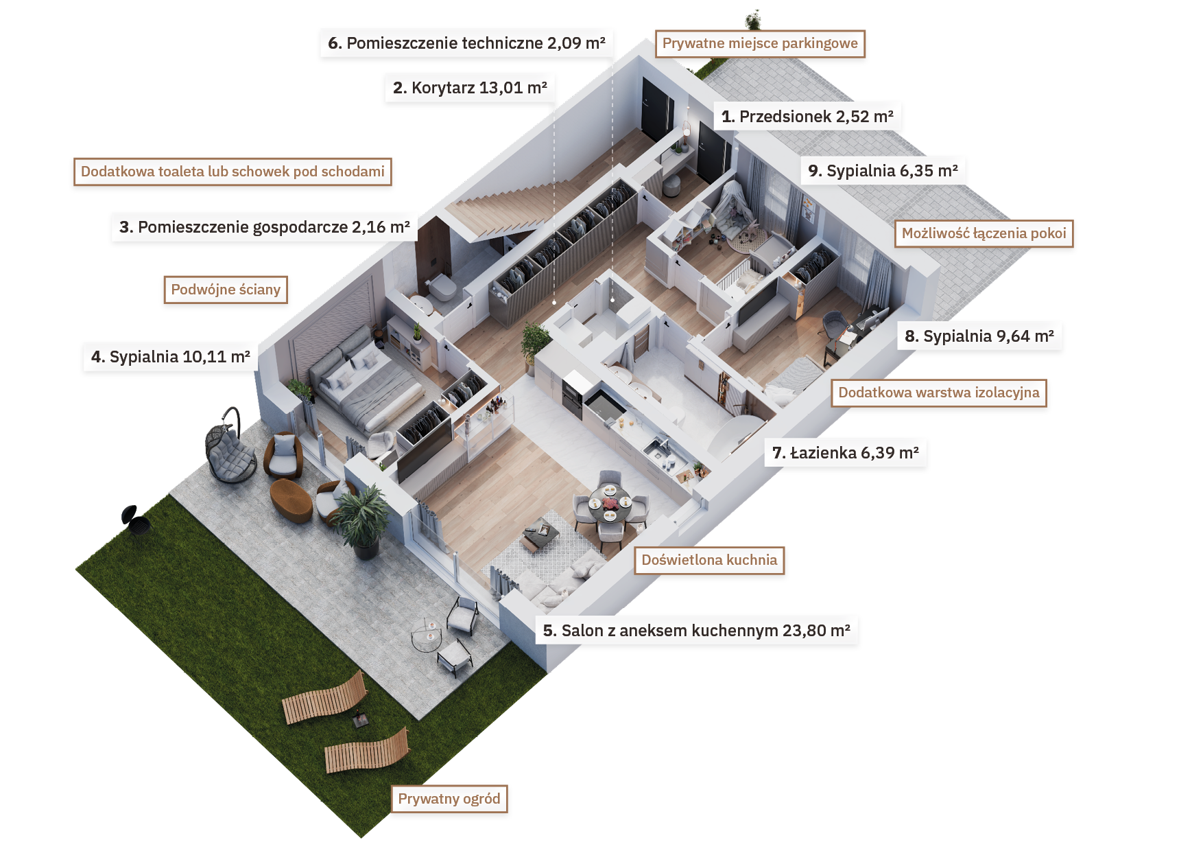 Osiedle zostało zaprojektowane z myślą o oszczędnościach – zastosowanie energooszczędnych technologii, takich jak pompy ciepła czy pakiety okienne minimalizujące straty ciepła, sprawia, że koszty utrzymania bezczynszowych apartamentów są wyjątkowo niskie. Wnętrza mieszkań zapewniają również komfortową ciszę – podwójne ściany między budynkami znacząco poprawiają izolację akustyczną, zapewniając spokojną atmosferę w każdym pomieszczeniu.