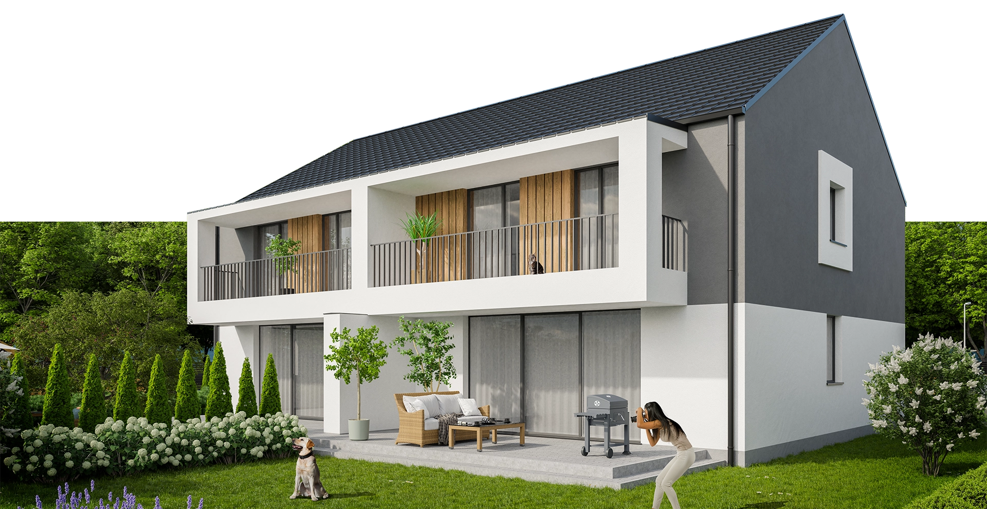 Apartamenty w domach dwulokalowych mają powierzchnię 72 m² (parter) oraz 83 m² (piętro). Do mieszkań na parterze przynależy duży taras i ogródek, natomiast lokale na parterze oferują taras i dodatkowe pomieszczenie na poddaszu do dowolnej aranżacji. Prywatne wejście oraz własna klatka schodowa gwarantuje maksimum prywatności. Do każdego apartamentu przynależą dwa miejsca parkingowe. Wszystkie mieszkania posiadają dostęp do ogródka, prywatnego lub wspólnego dla całego osiedla.